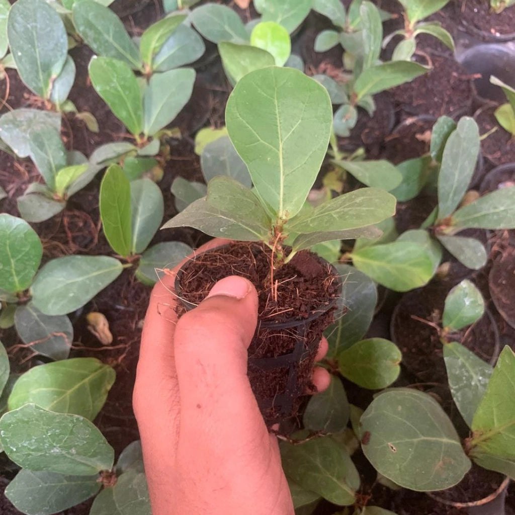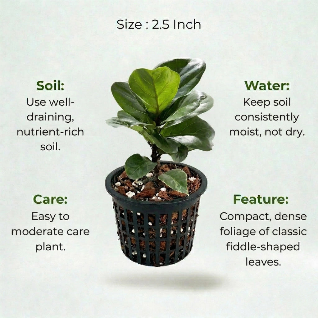 Dwarf Fiddle Leaf Fig Plant sapling has thicker and rounded leaves. It has a bushier and wider spread which can glam up your living room. This plant will come in a 1-inch net pot. Please do not remove the plant from the net pot; plant it directly in a larger pot. Do not overwater the plant. Also, check out our workshops for more details.